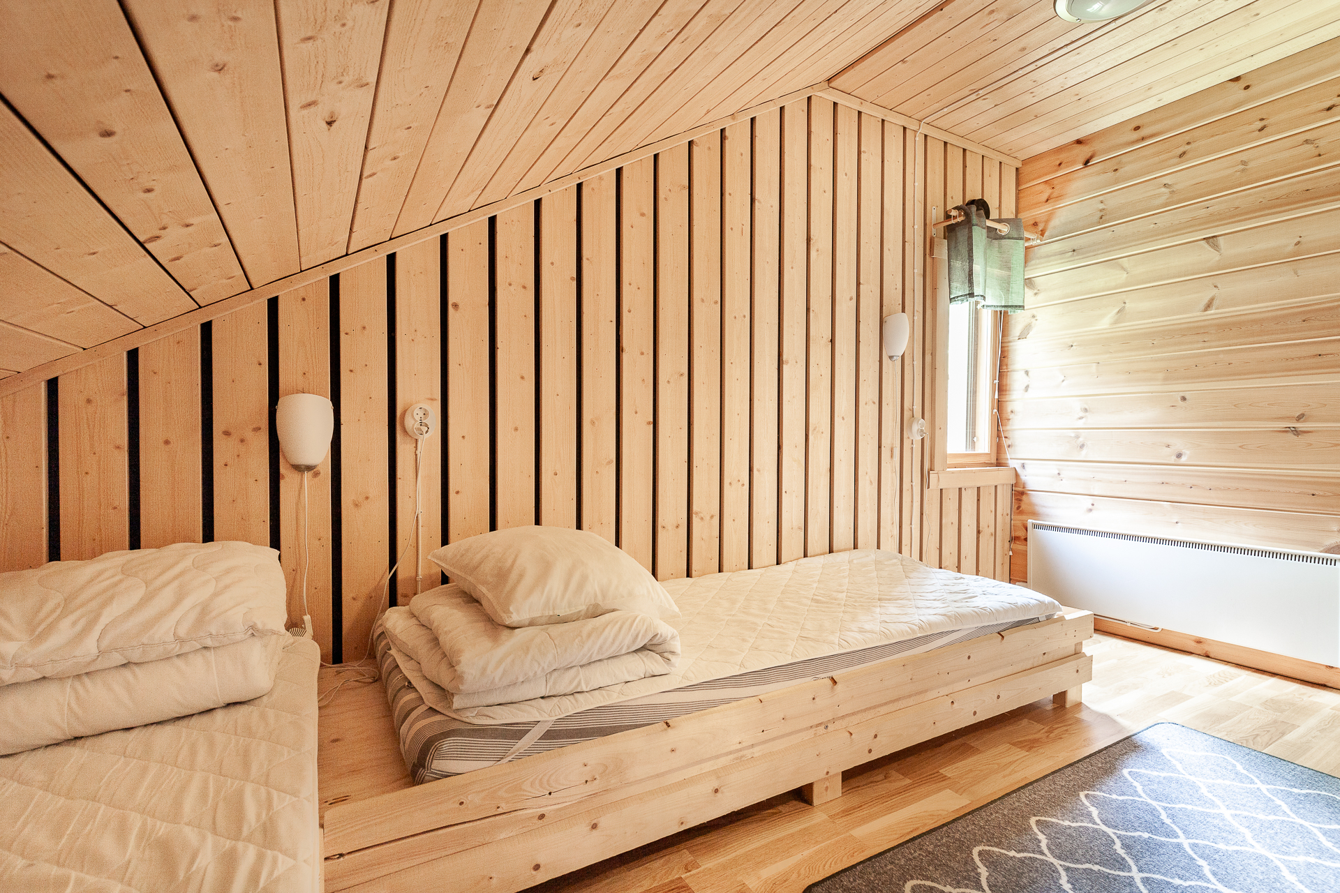 MAJOITUSTILAT: Vuodepaikkoja mökissä on 15 vieraalle yhteensä viidessä makuuhuoneessa, joista 4 makuuhuonetta on yläkerrassa ja 1 alakerrassa. Varapatjoja on lisäksi muutamalle vieraalle, jolloin petipaikkoja on yhteensä jopa 20 vieraalle. Peittoja ja tyynyjä mökissä on vuodepaikkoja vastaava määrä.