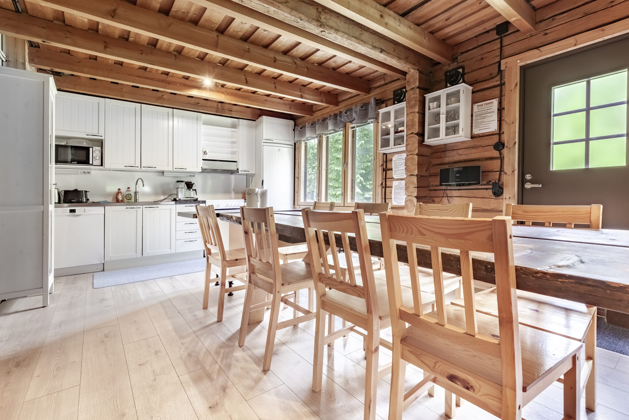 PÄÄSALI JA OLESKELU/KOKOUSTILAT: Mökin ruokasalissa/kokoustilassa on tilaa noin 15 vieraalle pitkän savottahenkisen pöydän äärellä. Wifi on käytössä ilman lisämaksua ja 40 tuuman taulutelevisio toimii myös kokousnäyttönä. Ruokasalista on suora yhteys terassille ja metsäpuutarhaan. Huomaathan, että mökki on sähkölämmitteinen, eikä historiallisten tulisijojen käyttö ole paloturvallisuussyistä mahdollista.