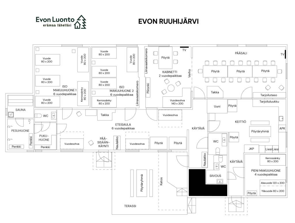 HINNOITTELU: Evon Ruuhijärven perushintaan sisältyy päärakennuksen tilat sisältäen sisäsaunan käytön sekä yksi rantasauna. Lisäpalveluna on mahdollista varata hirsinen juhla-aitta, toinen rantasauna, 1–2 kylpypaljua, grillikota, erillinen 4 hengen pikkuaitta yöpymiseen, lisäastiastot, loppusiivous, liinavaatteet pedattuina tai pinkkana sekä pyyhkeet.