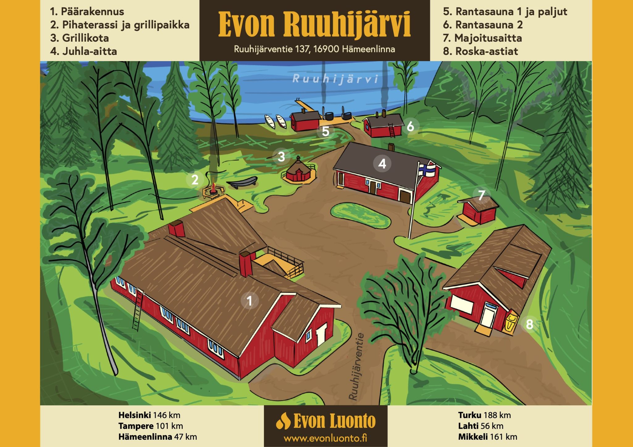 YLEISTÄ: Evon Ruuhijärvi on iso vuokramökki ja huvila, joka tarjoaa luonnonläheiset puitteet kaikenlaisiin tapahtumiin 1–60 hengen ryhmille. Rauhallisen erämaajärven rannalla sijaitsevassa huvilassa onnistuvat niin kokoukset, yritystilaisuudet, työyhteisön virkistys- ja tyky-päivät kuin kesä- ja talvilomat sekä kalastuspainotteiset mökkireissutkin.