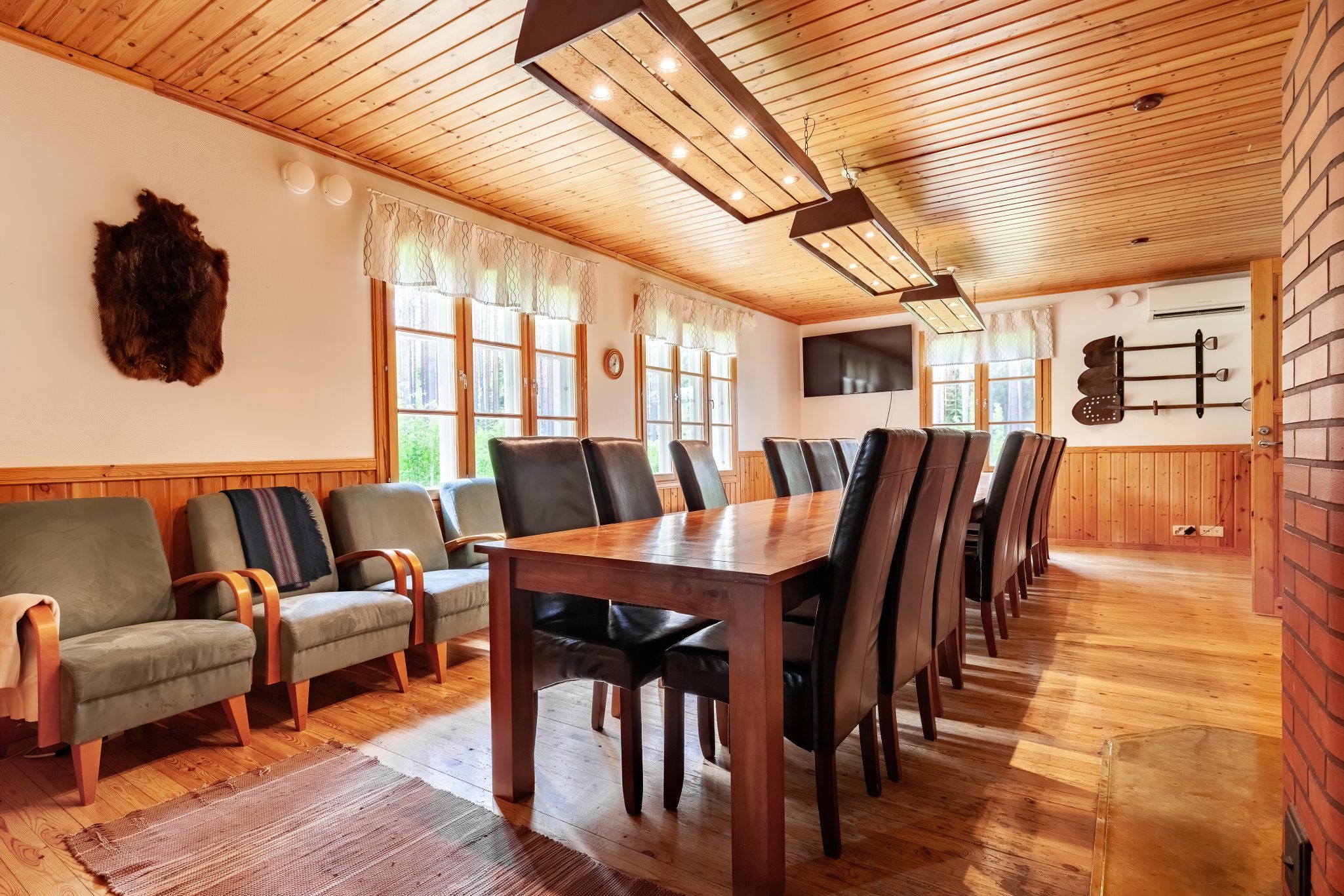 PÄÄSALI JA OLESKELU/KOKOUSTILAT: Päärakennuksen pääsalissa on tilaa noin 25 vieraalle. Varusteina ovat lisämaksuton wifi, fläppitaulu, valkokangas ja 55 tuuman taulutelevisio HDMI-liitännällä. Salin jatkeena on kabinetti, jossa mahtuu myös ruokailemaan noin 10 henkeä. Myös kabinetista löytyy 55 tuuman televisio.