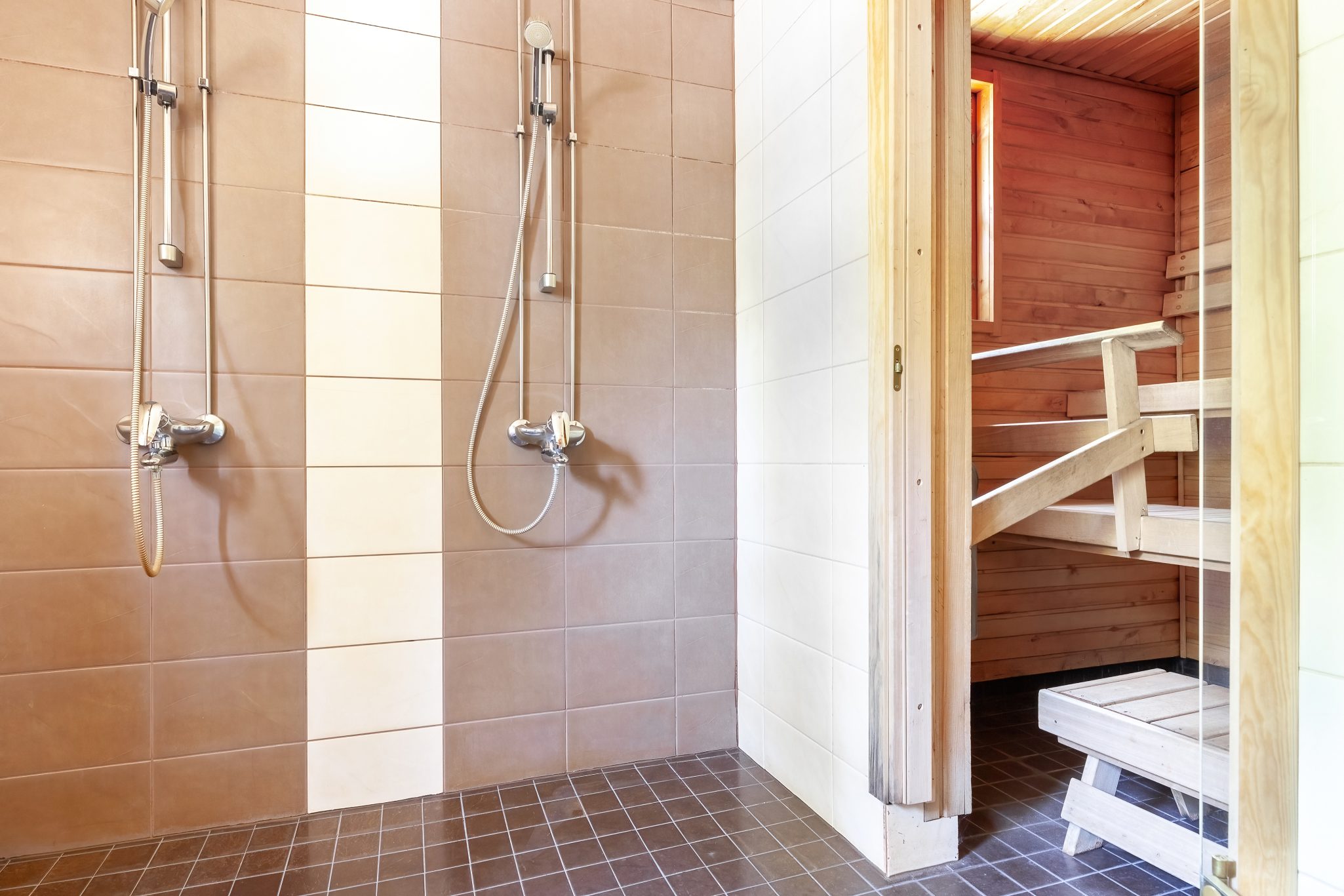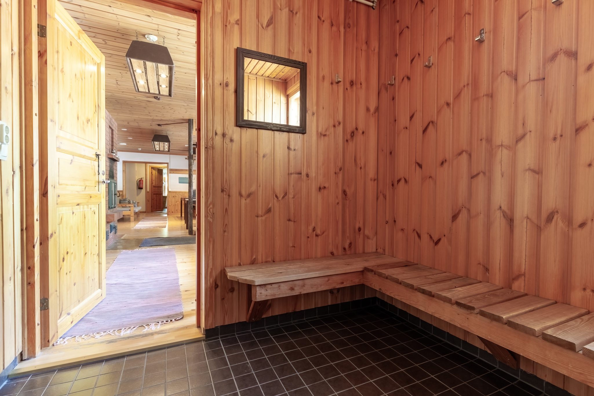 SAUNAT, SUIHKUT JA WC-TILAT: Päärakennuksessa on sähkölämmitteinen 4 hengen sisäsauna ja pukuhuone, 3 suihkua ja 3 erillistä wc:tä.