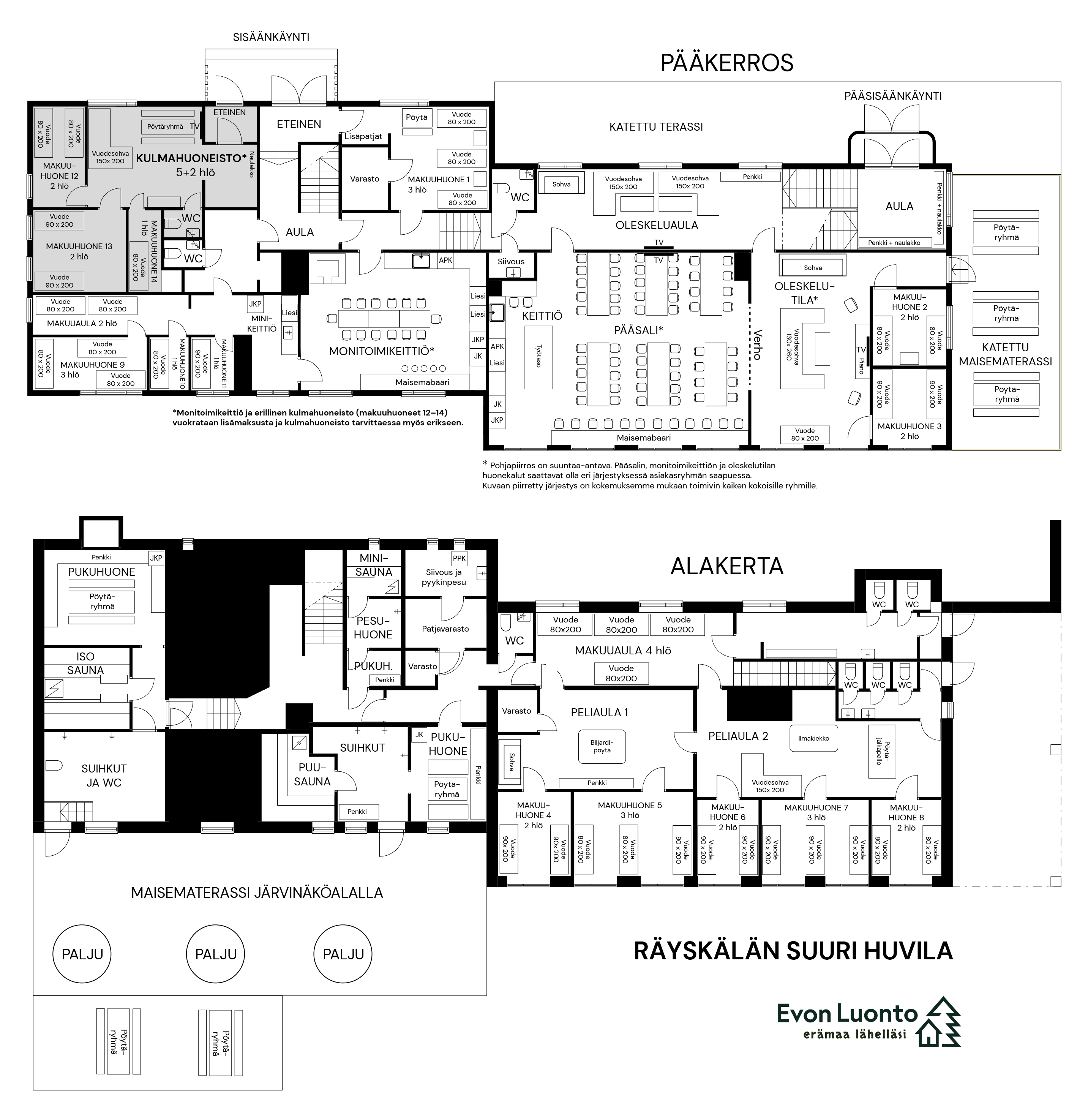 HINNOITTELU: Hintoihin sisältyvät monitoimihuvilan ja 2 saunan käyttö. Erillinen noin 50 neliön saunaosasto, 3 makuuhuoneen kulmahuoneisto ja sisäpelit lisämaksusta. Lisäpalveluna on mahdollista tilata mm. kylpypaljut, monitoimikeittiö, grillikatos, loppusiivous, liinavaatteet pedattuina tai pinkkana sekä pyyhkeet. Tarjoamme myös veneiden ja kanoottien vuokrauksen, ohjelmapalvelut ja ruokailupalvelut sekä työpalvelut; esimerkiksi saunojen ja paljujen valmistelut ennen vieraiden saapumista. Kaikki lisäpalvelut tulee tilata viimeistään 14 vrk ennen saapumista.