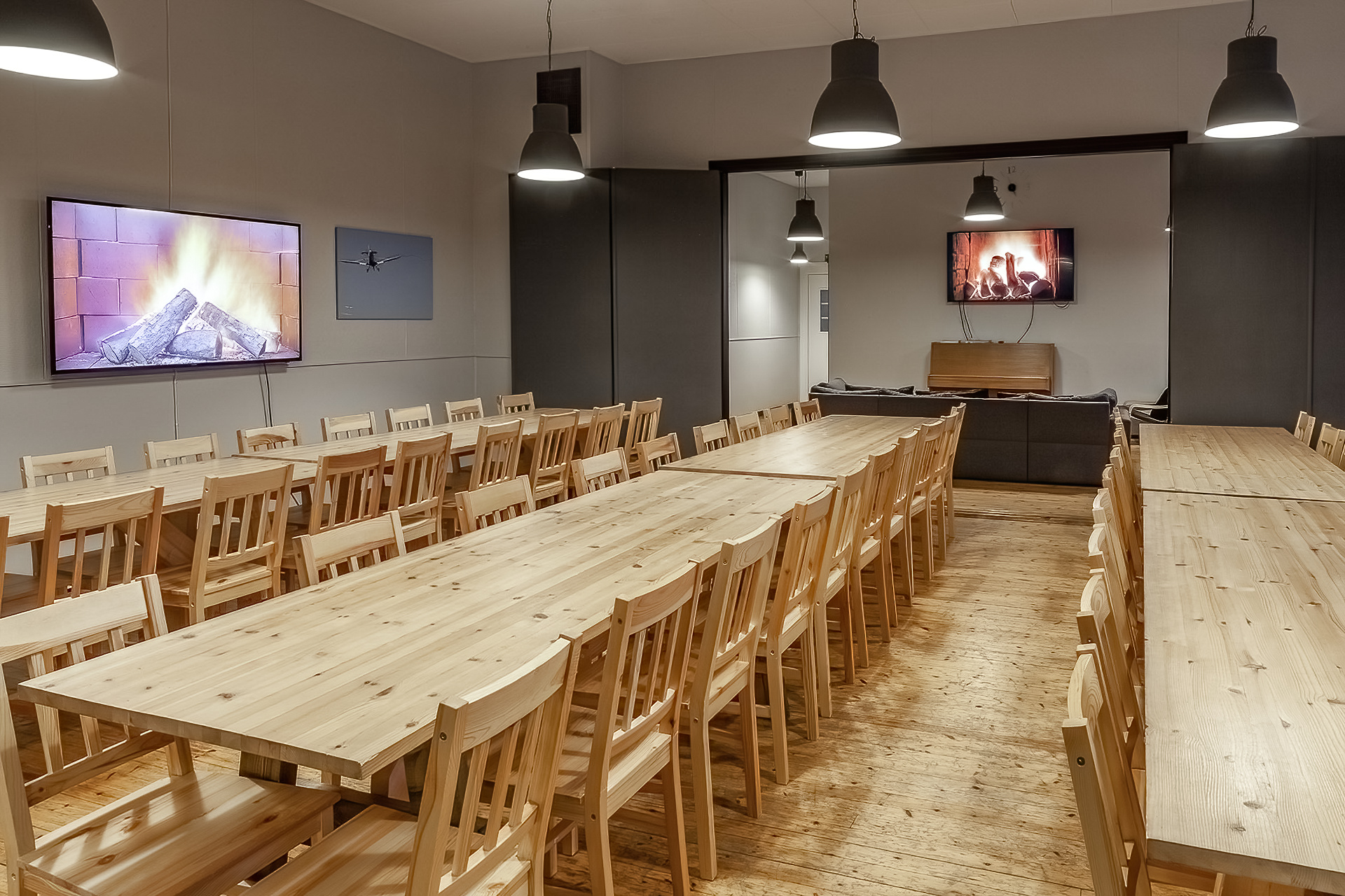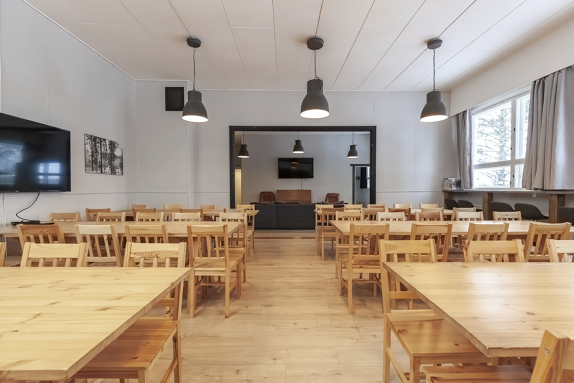 PÄÄSALI JA OLESKELU/KOKOUSTILAT: Noin 100 neliön pääsalissa ja siihen liittyvässä tupakeittiössä on tilaa lähes 80 vieraalle pitopöytien ja sohvaryhmien äärellä. Tilaa voidaan käyttää myös kokouksiin ja seminaareihin pöytäryhmiä siirtämällä. Pääsalissa on 2 taulutelevisiota, jotka toimivat myös kokousnäyttöinä sekä dataheitin ja valkokangas. Tila on varustettu lisämaksuttomalla wifi-yhteydellä.