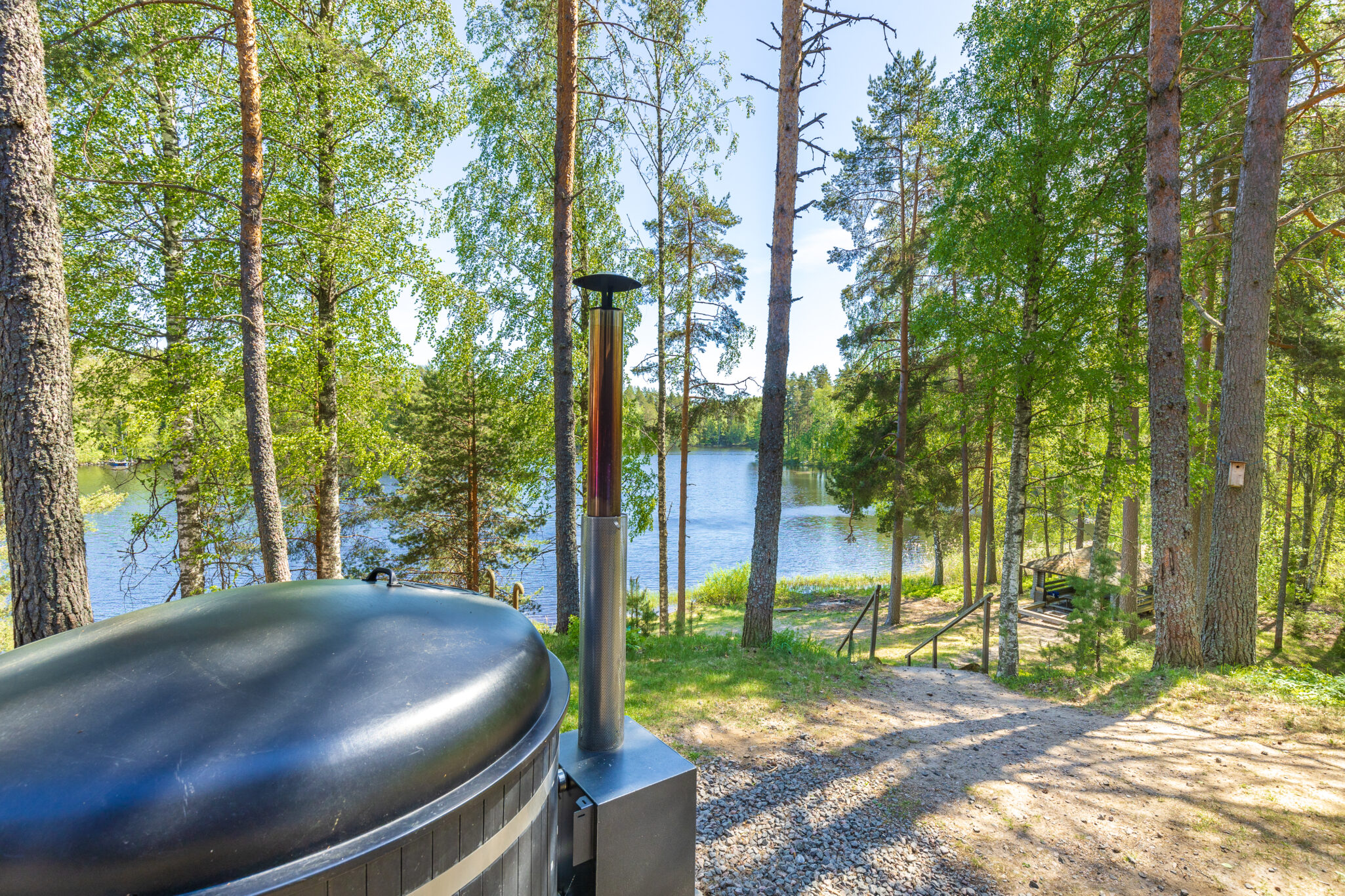 ULKOTILAT JA PALJUT: Terassilta löytyy 3 puulämmitteistä kylpypaljua. Kaartjärven rannassa on hirsinen grillikatos, jossa on tiilestä muurattu tulisija ja katoksen edustalla erillinen nuotiopaikka. Katokseen sopii noin 15 henkeä kerrallaan.
